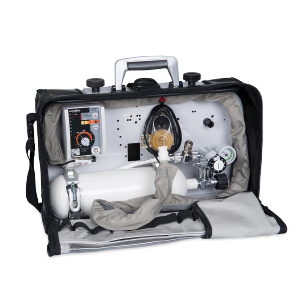 Портативний апарат штучної вентиляції, оптимізований для реанімації та роботи швидкої допомоги. Підтримує маску, суперголотичний апарат і інтубацію, забезпечуючи стабільні обʼєми та ритм дихання. Є режим CPR з метрономом і кнопка MEDUtrigger для швидкого дворазового подавання вдихів. Легкий, інтуїтивний у використанні — ідеальний для роботи на місці події.