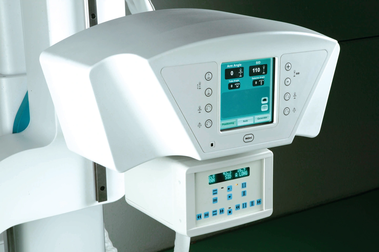 - Вбудований плоскопанельний детектор 43х43 см, на основі йодиду цезію з коротким циклом між експозиціями